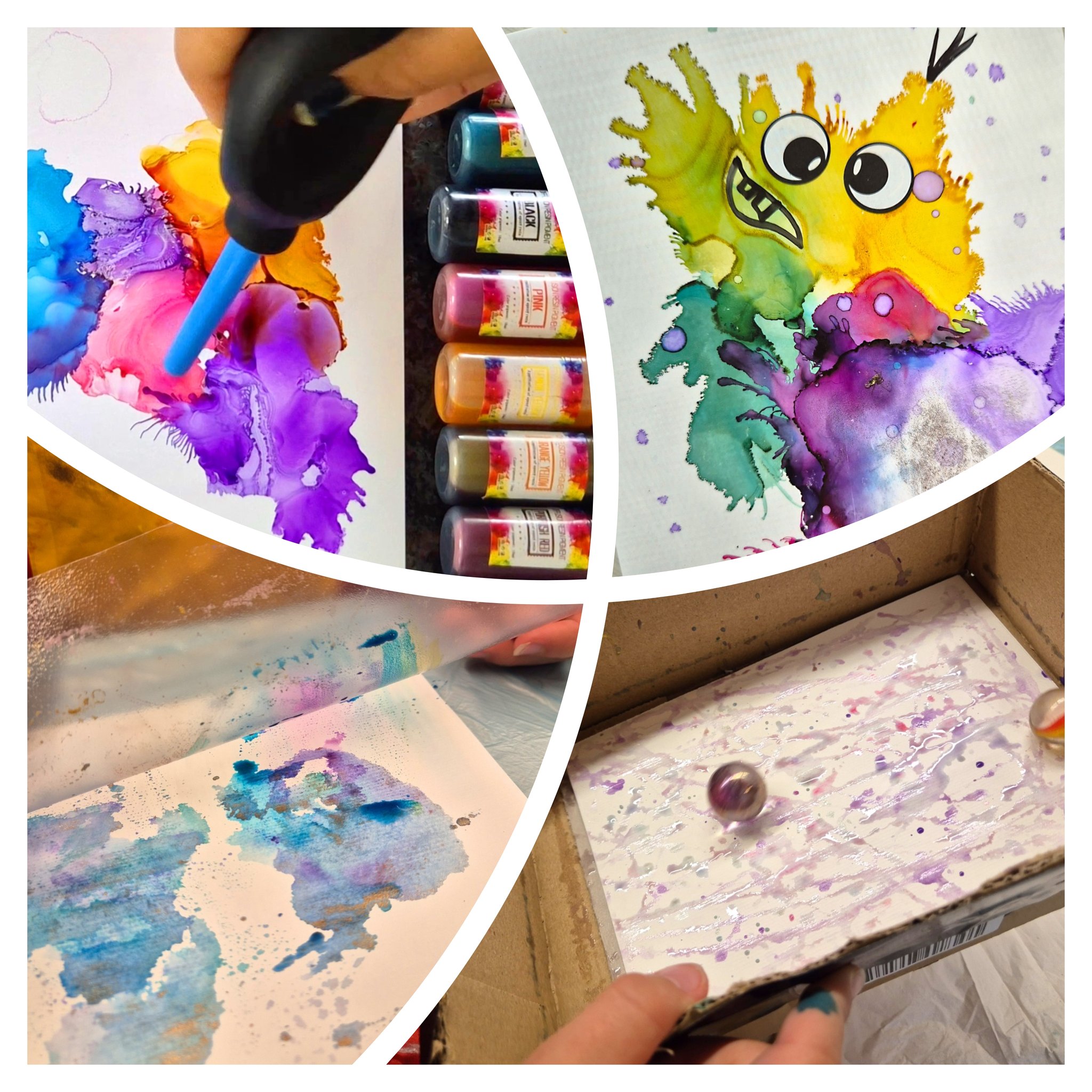 - Die Kreativ-Tinten werden auf die Postkarten getropft. Mit der Hand-Luft-Pumpe bringst du die Flecken in Form. Daraus können auch mit Augen und Mund lustige Monster entstehen.