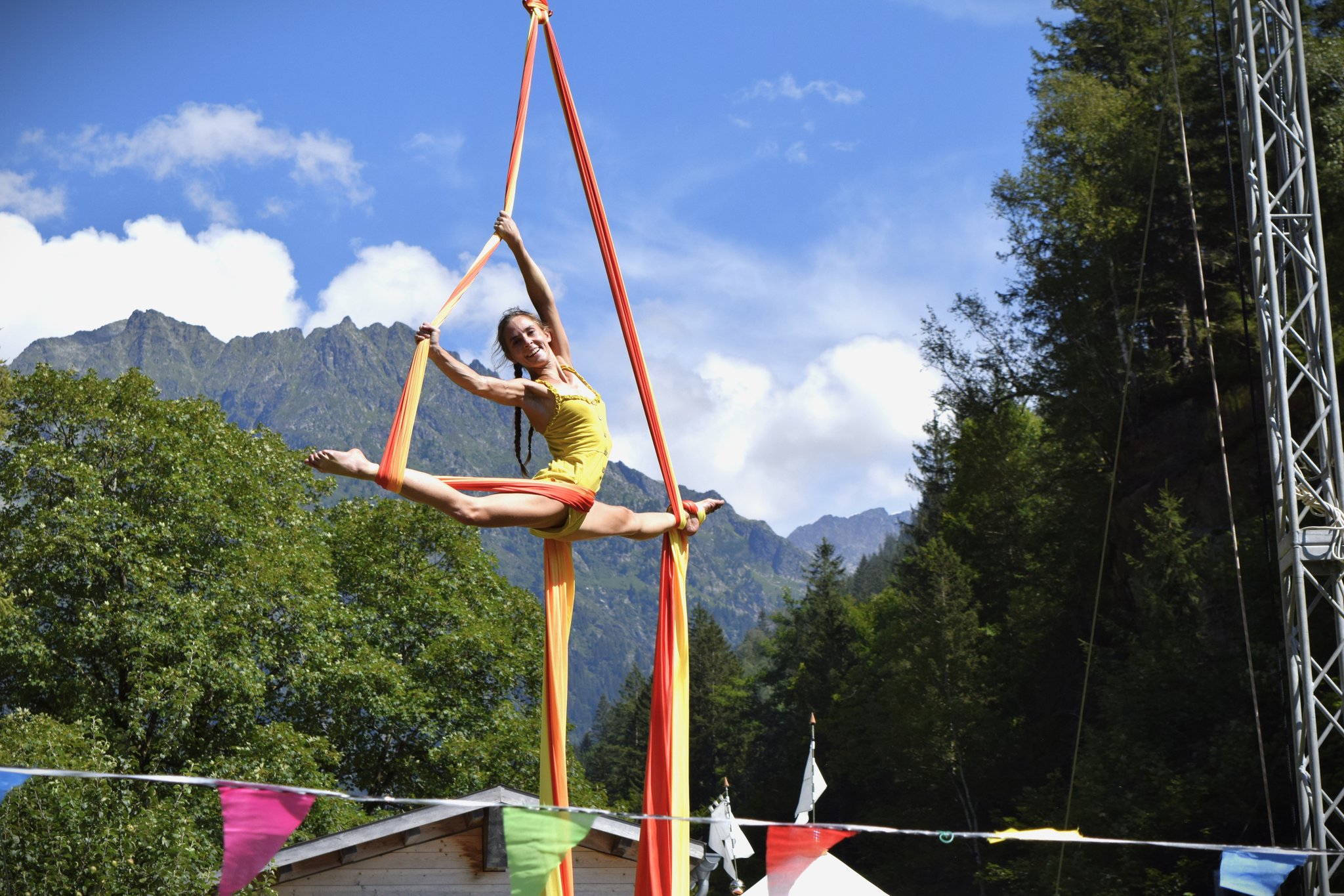 Du erhälst einen Einblick in die Luftakrobatik - Welt und lernst erste Figuren im Vertikaltuch oder im Sling (Tuchschlaufe). Dabei steht die Neugier, Spiel und Spass immer im Zentrum.